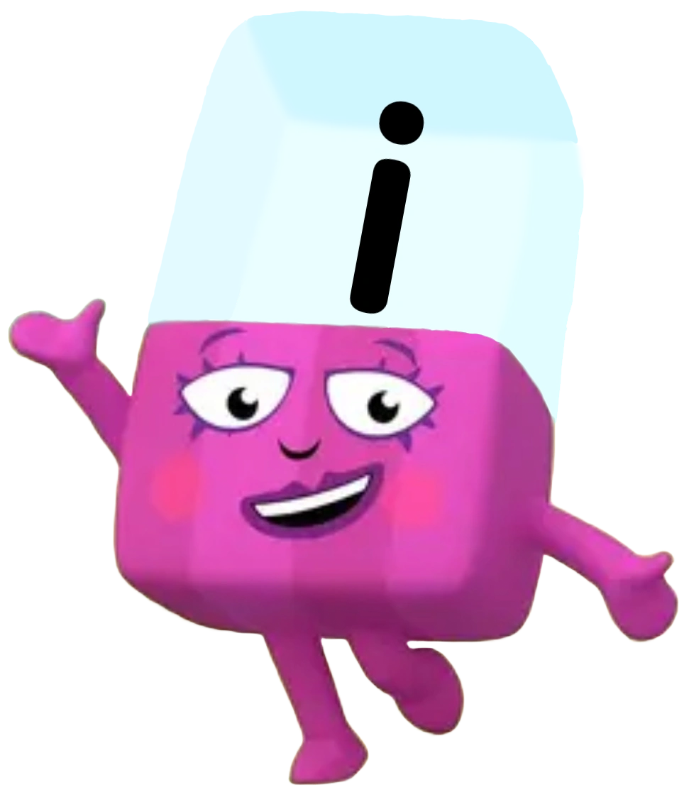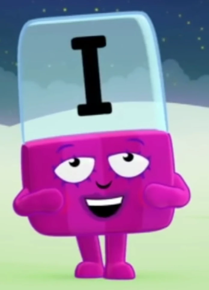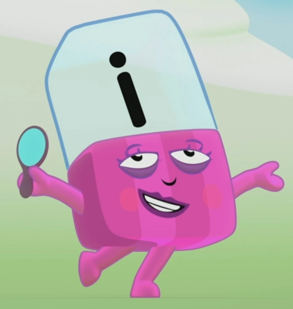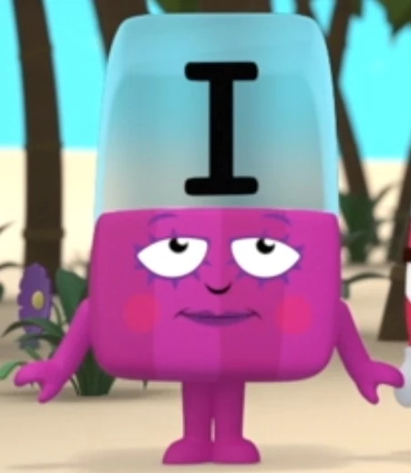 I is a fuchsia Alphablock with stripes, red blush, and purple eyelashes. She often holds a hand-held mirror with a pink frame, using it to admire her face.